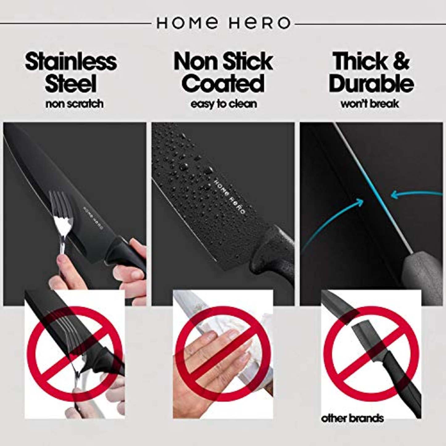 - This stainless-steel knife set gives you superior blades plus ergonomic PP handles. Sharp, sturdy & practical. No rust, stains or pitting here! Home Hero brings together a unique mix of