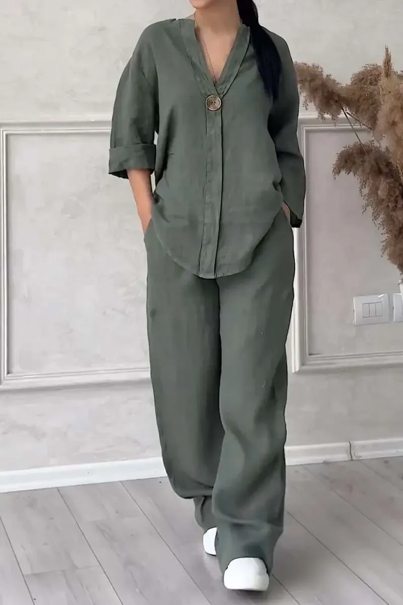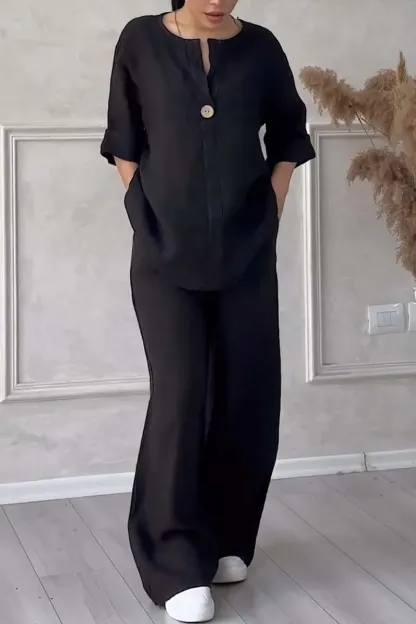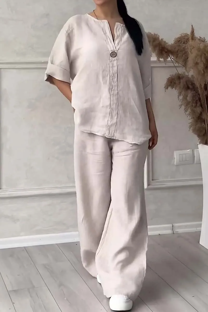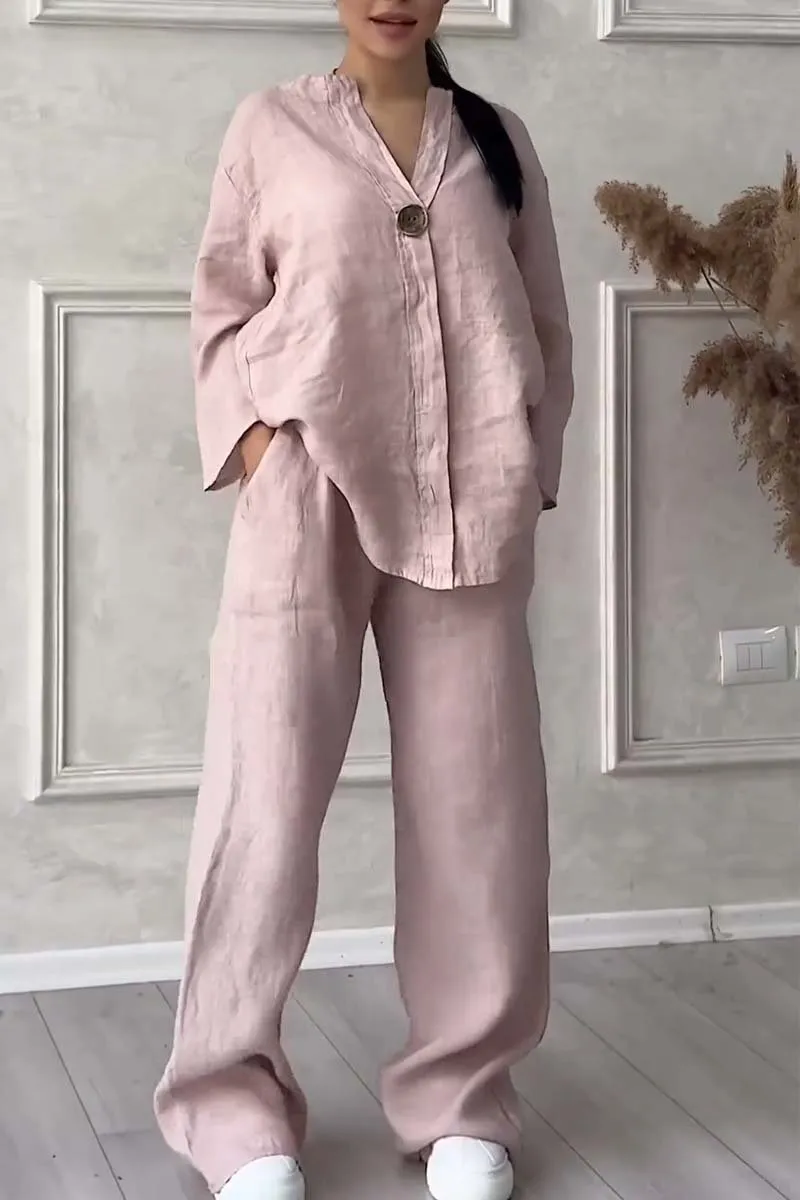 Women Casual button decorated cotton and linen two-piece set
